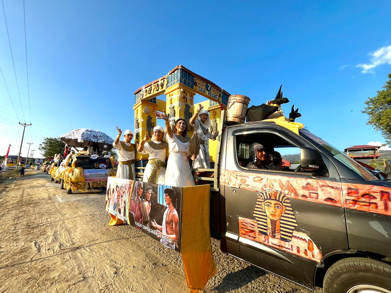 “Biasanya karnaval Paskah hanya bersifat umum, tetapi di Palu dan Sigi kami mengemasnya dalam bentuk cerita Alkitab secara utuh. Dimulai dari penciptaan, Adam dan Hawa, kejatuhan manusia, kisah para nabi, hingga Perjanjian Baru tentang kelahiran Tuhan Yesus, pelayanan-Nya bersama murid-murid, kematian, kebangkitan, kenaikan ke surga, dan ditutup dengan peristiwa Pentakosta,” jelasnya.