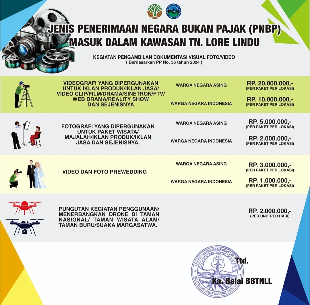 JOURNALRAKYAT.COM, PALU – Balai Taman Nasional Lore Lindu (BTNLL) Provinsi Sulawesi Tengah mengumumkan bahwa mulai tahun 2024, pengambilan dokumentasi visual di kawasan taman nasional ini akan dikenakan biaya.